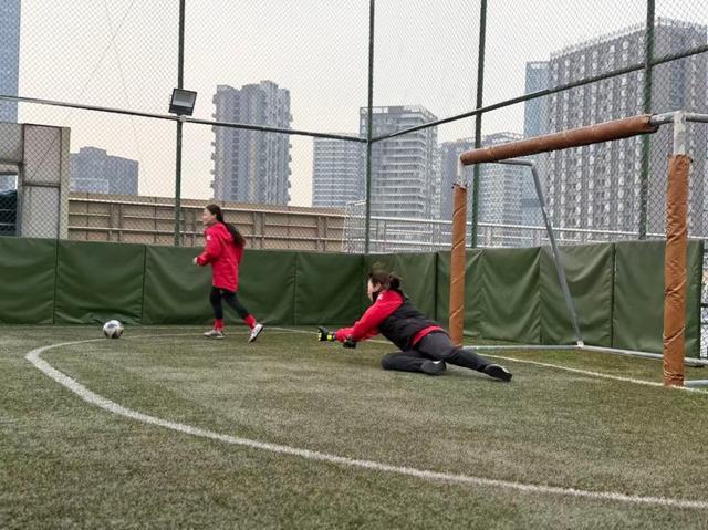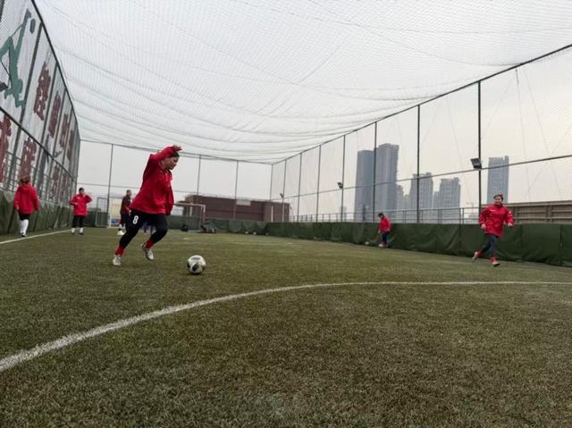 聋人女足的姑娘们,在教学楼顶被绿网包围起来的“空中足球场”训练